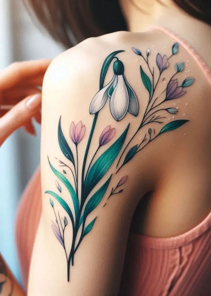 - Якщо ви хочете додати яскравості до свого татуювання, акварельний стиль з підсніжниками стане чудовим рішенням. Тоновані плавні переходи кольорів — від ніжних рожевих і фіолетових до світло-зелених відтінків — створять відчуття легкості та повітряності.