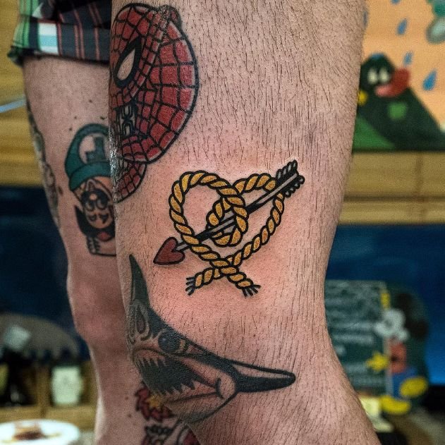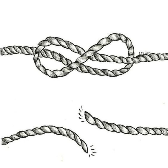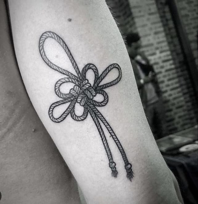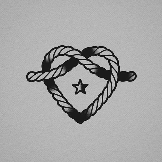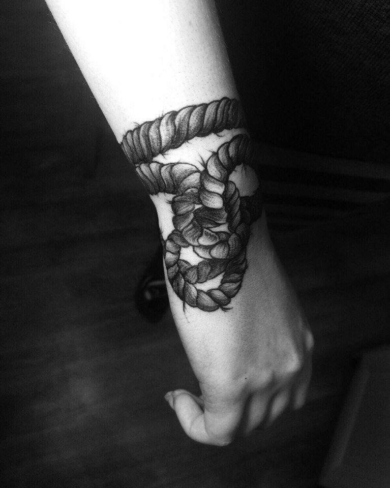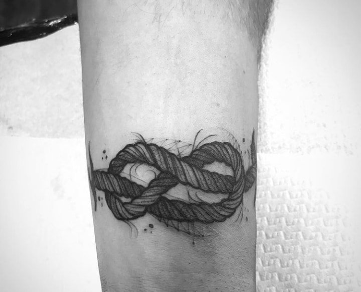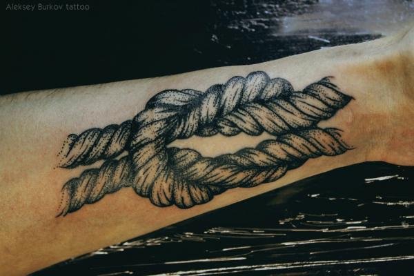 Дуже часто зображують на тілі татуювання мотузки, які символізують знак нескінченності. Даний тату ескіз виконується майстрами з зав'язаним вузлом посередині. Таке зображення несе дуже позитивну енергетику і символізує сильну любов до коханого. Даний тату ескіз символізує гармонію і сильний взаємозв'язок, дуже часто молоді закохані люди роблять такі тату в парі.